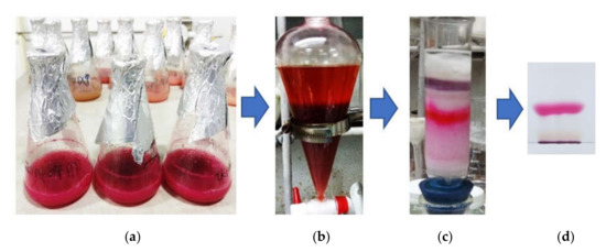 The process of PG purification. The liquid culture medium fermented by S. marcescens TNU01 under optimal condition (a) was centrifuged to obtain the supernatant containing PG, which was primarily extracted by ethyl acetate (b). The crude PG containing in the ethyl acetate layer was next separated on a silica gel column (c) and finally, isolated as a pure compound by TLC separation (d).