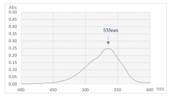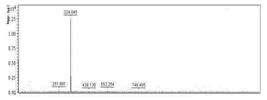 PG, a secondary metabolite is mainly produced by the bacterium S. marcescens [21]. The red pigment synthesized by S. marcescens TNU01 extracted and purified in this study was reconfirmed as PG through some rapid techniques, including its mass and UV absorption. As shown in Figure 6 and Figure 7, this purified compound exhibited mass (M + 1) of 324.045, and maximum UV absorption at 535 nm, concurrent with the specific mass and UV absorption of PG [11,39]; therefore, this purified pigment was determined as PG.