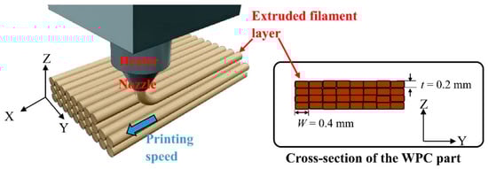 All WPC parts were fabricated with a 0.4 mm nozzle using a customized FDM printer (Creator Pro, Flashforge Corp., Zhejiang, China). The process parameters were set in Flashprint software combined with Slicer software to control the printer. As depicted in Figure 1, the extruded filament layers were assembled by layer-by-layer movements of the nozzle along the printing axis (X-axis) and without a contour. The structural part of the WPC sample was fabricated by extruded filament layers with a printing layer thickness (t) and width (W) of 0.2 mm and 0.4 mm, respectively. Three printing speeds (30, 50, and 70 mm/s) were used to print the samples, which were designated WPC30, WPC50, and WPC70, respectively. During printing, the temperature of the build platform was 50 °C, and the extrusion temperature was 210 °C. Additionally, the printing times of the printed parts were recorded, and the time saving percentage (TSP) was calculated as compared to the time required for WPC30.