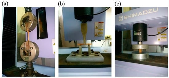Setups of the tensile test (a), flexural test (b), and compressive test (c).
