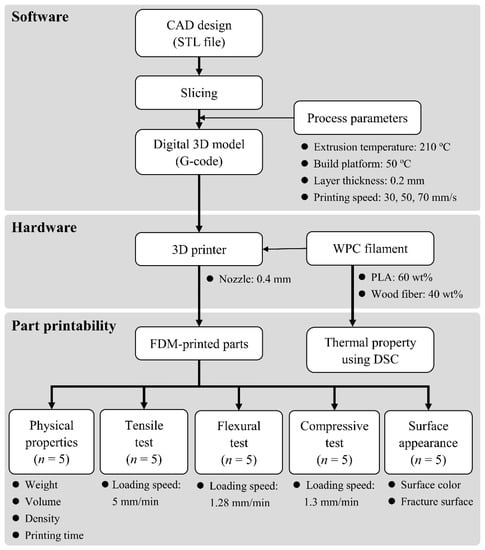 To a better understanding, Figure 4 schematically presents the work plan of the present study, from the FDM printing to the printability and physicomechanical properties of the printed parts.