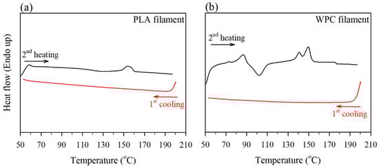 DSC thermograms of the PLA filament (a) and WPC filament (b) at the the first cooling process (10 °C/min) and the subseguent second heating process (10 °C/min).