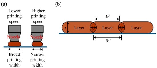 Schematics of the influence of printing speed on the printing width of the layer (a) and the adjacent layer with the overlapped offset (b).