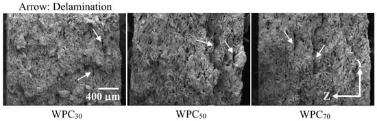 Figure 9 provides SEM micrographs of the fracture cross-sectional surfaces of the WPC parts at various printing speeds after tensile testing. In the case of WPC30, few fiber pull-outs and fiber breakages occurred on the fracture surface. This phenomenon may be related to the thermal degradation of the wood fibers and good fiber/PLA bonding interactions since the wood fibers were more heat treated at the lower printing speed. When the printing speed increased to 70 mm/s (WPC70), pull-outs of wood fibers were clearly observed more often compared to the part printed at a lower printing speed. This phenomenon occurs with most wood fibers, which have poor adhesion with the PLA matrix. Furthermore, WPC30 exhibited the highest CS (31.8 MPa) and CM (852 MPa) values among all the samples. As the printing speed increased to 70 mm/s, the CS and CM values of the part (WPC70) significantly decreased by 34.3% and 14.6%, respectively, comparted to those of the WPC30. When the printed part was subjected to longitudinal compression along the printing orientation (X-axis), the internal bonding strength between adjacent layers mostly affected the compressive load-carrying capacity of the WPC part [21]. Therefore, the results indicated that the WPC70 had the lowest bonding strength between layer interfaces due to minimal bonding between adjacent layers. In contrast, when the printing speed decreased to 30 mm/s, more overlapping adjacent layers resulted in better bonding and thus better compressive performance. As shown in Figure 10, interface debonding between adjacent layers in the damage evolution of all the samples was observed as a result of the kinking and buckling of the filament layers. Additionally, the transverse deformation of the compressed WPC part mainly occurred along the Z-axis rather than along the Y-axis (Figure 8). This behavior is attributed to the fact that the interlayer bonding in the Z-axis is poorer than that in the Y-axis. From the fracture patterns in the broken cross-sections (Figure 9), delamination was observed between two layers in the XY-plane due to weak bonding in the Z-axis at various printing speeds. As mentioned above, these results summarize that FDM printing at a high printing speed can decrease the compressive performance of the WPC part, whereas the tensile and flexural properties of the printed samples are independent of the printing speed.
