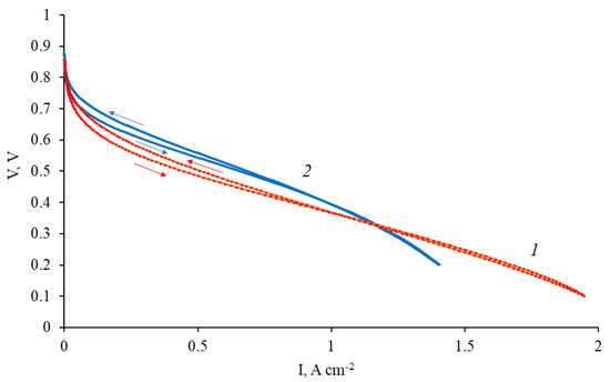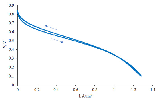 The polarization curve for the composite material Pt/2 used as cathode in the membrane–electrode assembly with PBI–OPht membrane at 180 °C is shown in Figure 9.