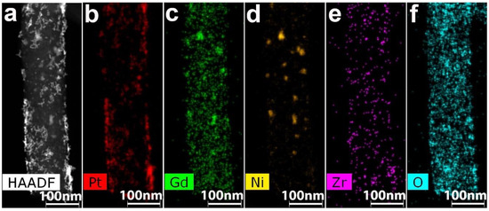 (a) HAADF STEM image; EDX distribution maps for (b) Pt, (c) Gd, (d) Ni, (e) Zr and (f) O for the Pt/2 composite.