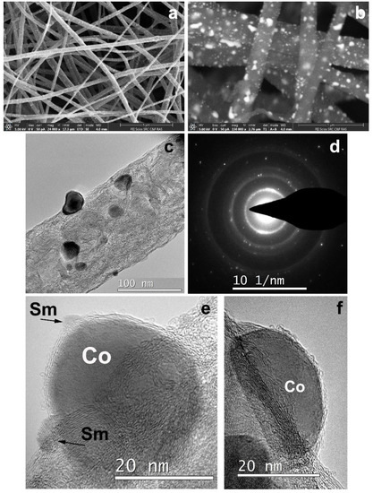 Structure of 3: (a) and (b) SEM images of CNF containing metal particles; (c) enlarged image of carbonized nanofiber; (d) Sm and Co reflexes in SAED pattern; (e) and (f) HRTEM images of Sm and Co particles grown on the surface of CNF.