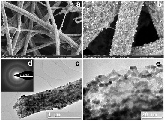 CNF/Co/Sm structure for Pt/3: (a) and (b) SEM images; (c) and (d) a fragment of CNF and corresponding SAED pattern; (e) Pt morphology.