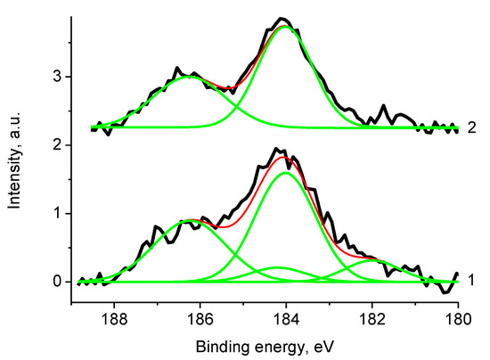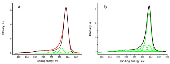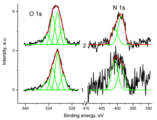 The X-ray photoelectron spectra were recorded using an Omicron spectrometer (Omicron NanoTechnology, Taunusstein, Germany) and a Sphera II hemispherical electron energy analyzer with Mg and Al Kα radiations in the fixed analyzer transmission mode. Survey and high-resolution spectra of appropriate core levels were recorded at pass energies of 160 and 40 eV and with step sizes of 1 and 0.1 eV, respectively. The energy scale of the spectrometer was calibrated to provide the following values for reference samples (i.e., metal surfaces freshly cleaned by ion bombardment): Au 4f7/2 83.96 eV, Cu 2p3/2 932.62 eV, Ag 3d5/2 368.21 eV. Sample area of 5 mm × 700 mm contributed to the spectra. The residual pressure inside the analysis chamber was lower than 5.0 × 10−9 mbar. The photoelectron spectra were approximated by Gauss function or the sum of Gauss functions, and the background caused by secondary electrons and photoelectrons that lost energy, was approximated by Shirley-type background line. Quantification was performed using atomic sensitivity factors included in the software of the spectrometer. The samples were mounted on a sample holder with a two-sided adhesive tape. The spectra were collected at room temperature. Sample charging was corrected by referencing to sp2-state deconvoluted in the C 1s spectrum (284.44 eV) [46]. In the absence of sp2-state, C–C/C–H state was used with assignment energy of 284.8 eV.