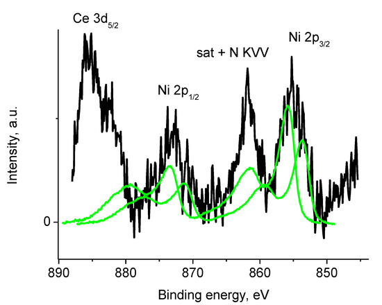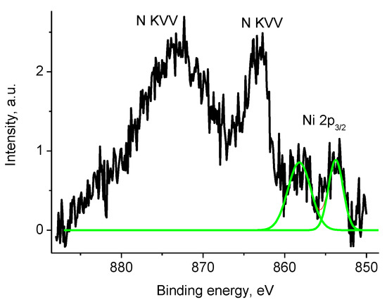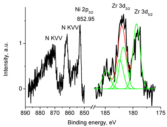 The Ni 2p and Zr 3d photoelectron spectra and N KVV Auger spectra of sample 2 (initial spectra—black, basic curves—green, resulting curve—red).