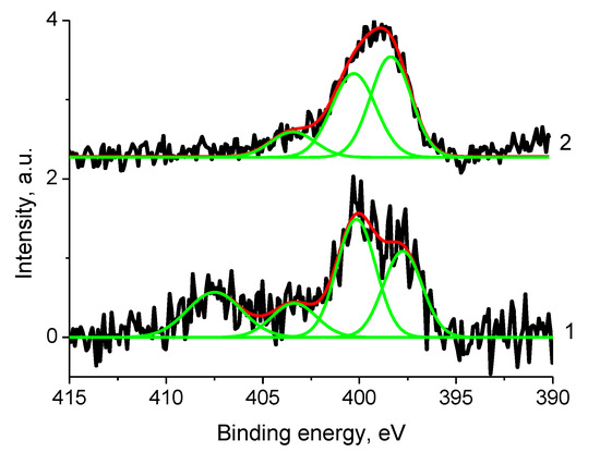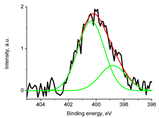 The N 1s photoelectron spectrum of sample 2 (initial spectra—black, basic curves—green, resulting curve—red).