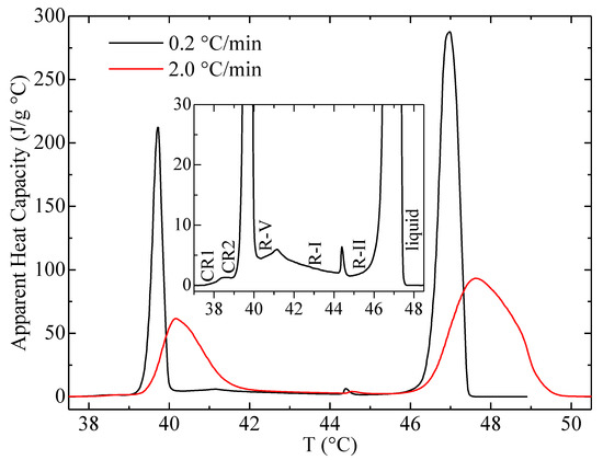 Secondly, and as commented above, the two transitions CR2 to R-V and R-V to R-I are merged at the heating rate of 2 °C/min in what appears to be a single DSC peak. This means that probably the R-V phase is always accompanied by a certain proportion of either CR2 or R-I [