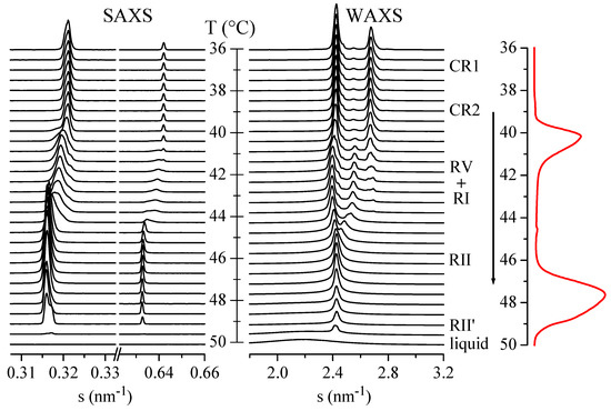 As commented above, real-time variable-temperature SAXS/WAXS experiments with synchrotron radiation were performed in the temperature interval from 36.0 to 52.0 °C, which covers all the aforementioned transitions.