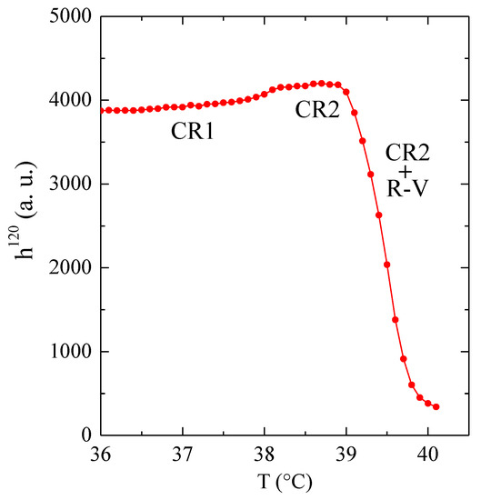 Figure 10a shows the dependence on temperature of the peak position of the first overtone. It displays a subtle increase, almost inside the experimental error, when R-V and R-I are present, but decreases again to the initial values for R-II. The peak position of the CH