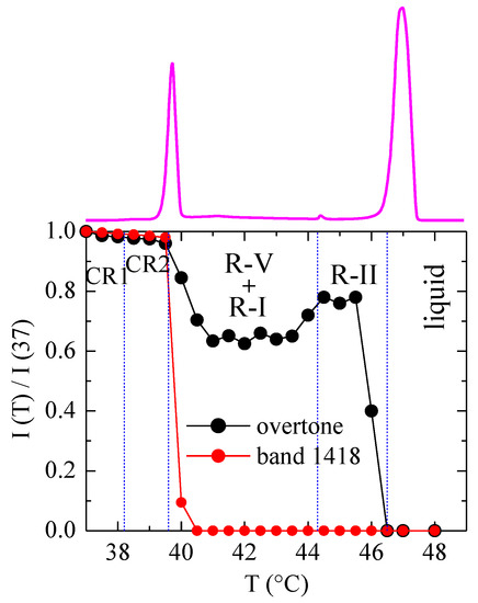 As mentioned, the band at 1418 cm−1 disappears above around 40.5 °C, so that the ratio I(T)/I(37) for this band is zero for all the rotator phases (and for the liquid). More informative is the ratio for the overtone. As observed, it decreases very slightly (temperature effect only) until 40 °C, with no appreciable discontinuity through the transition from CR1 to CR2. Next, it decreases by around 40% when reaching the R-V and R-I phases, and, interestingly, there is a significant increase when R-II is formed. The intensity of this first overtone (and probably also of the accordion mode, not seen here) is, therefore, rather dependent on the phase present.