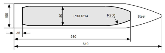 Geometries of the projectile and the inner PBX1314 main explosive. All the size parameters are in millimeters.