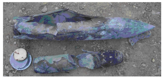The projectile and PBX1314 after a 602 m/s penetration experiment is displayed in Figure 2. The head of the projectile deformed slightly. Only a little mass abrasion occurred. However, the cylindrical part of the projectile expanded and fractured. It resulted from the non-shock initiation of PBX1314. The PBX1314 broke in two when it was taken out of the projectile. The mechanically damaged zone was distributed from the tail to the middle part of PBX1314. Initiation occurred in the tail part in a certain moment during penetration. The generated gas products and liberated energy during the initiation raised the internal pressure and temperature of the projectile. The increase in temperature and internal pressure led to the expansion and fracture of the projectile. In addition, the experimental results indicate that the initiation finally quenched rather than growing to detonation.