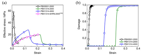 Dynamic mechanical responses of PBX1314 and PBX9501 under uniaxial compressions. (a) Stress–strain curves, (b) damage–strain curves.