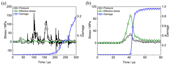 The mechanical responses of PBX1314 in multi-axial impact experiments [26] in which the input bar is 60 mm in length and the impact velocity is 31.8 m/s are calculated and shown in Figure 5a. The first peak of pressure is 30 MPa, which agrees well with the experimental data 29.075 MPa [26]. In the beginning stage, the pressure is higher than the effective stress. All microcracks in the specimen are friction-locked and no crack growth occurs. After the initial impact, the stress state of the specimen undergoes a complex evolution process. Tensile hydrostatic stress and effective stress in corresponding periods result in microcracks growth and material damage. The curves in Figure 5a indicate the ability of the dynamic damage model in predicting the dynamic multi-axial mechanical responses of PBX1314.