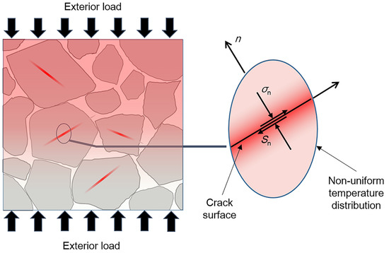 Along with damage accumulation, PBXs would experience bulk temperature rise due to adiabatic compression, viscous dissipation or other mechanisms when exposed to exterior stimuli. Meanwhile, interfacial friction of microcracks in PBXs leads to heat generation and accumulation near the microcracks. Heat accumulation in local regions results in non-uniform temperature distribution in PBXs. The heating process and non-uniform temperature distribution are illustrated in Figure 6. Hotspots’ formation or even initiation might occur due to the non-uniform temperature field. In this section, a non-shock initiation model of PBX1314 is presented to study the temperature evolution properties of PBX1314 related to different heating mechanisms. A non-uniform initiation criterion of PBX1314 under mild stimuli is developed.