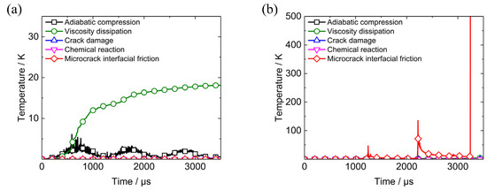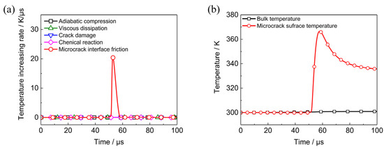 Bulk temperatures and microcrack surface temperatures of the two elements are plotted in Figure 17e,f. The temperature rises in the two elements due to different heating mechanisms, are shown in Figure 18. The curves in Figure 18a reveals that viscous dissipation contributes greatly to the bulk temperature rise in Element A and no microcrack surface heating occurs because of the friction-locked state of the dominant microcrack. Therefore, the microcrack surface temperature equals the bulk temperature in Element A all the while. This indicates that the temperature distribution in Element A is uniform. The temperature is much lower than 700 K and initiation does not occur.