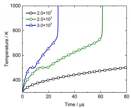 The heating rate at different temperatures calculated by the Arrhenius chemical reaction model is given in Figure 10. The steep rise at 700 K indicates that initiation is activated. Therefore, it is reasonable to consider the initiation temperature as 700 K. The initiation time tinitiation is defined as the time that the microcrack surface temperature increases from bulk temperature to initiation temperature under the condition of a constant heat flux rectangular wave.