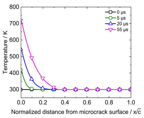Temperature distribution near the microcrack when the heat flux is 2.5 × 107 J·m−2·s−1 is shown in Figure 9. In view of symmetry, only the temperature on one side of the microcrack surface is plotted. The horizontal axis is the ratio of the distance to the microcrack surface to the micorcrack radius. Figure 9 indicates that the frictional heat accumulates near the microcrack surface and leads to temperature increase. The maximum of the temperature is on the microcrack surface. The temperature drops rapidly as the distance to the microcrack surface increases. It decreases to bulk temperature when the distance is 0.3ca. The temperature distribution in Figure 9 implies that the accumulation of frictional heat leads to a symmetric high temperature zone near the microcrack. The feature size of the zone is relatively small and the temperature in this zone is higher than the bulk temperature.