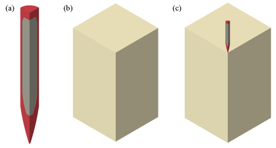 Finite element model of the penetration of an earth penetrating missile (EPM) with PBX1314 charge into a concrete target. (a) a missile (the red part) with PBX (the grey part), (b) a concrete target, (c) assembly of the missile and the target.