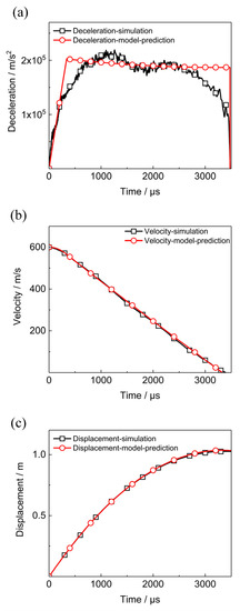 The simulated deceleration, velocity and displacement of the projectile in the case of the initial impact velocity is 602 m/s are plotted in Figure 13. Predictions of the deceleration, velocity, and displacement based on the cavity expansion theory [32] are also shown in Figure 13. These agreements between the predictions and the simulated results verify the creditability of the simulation results of the finite element model.