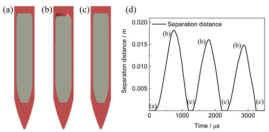 Deformation of the PBX1314 in the projectile. (a) The initial state. (b) Separation in the tail. (c) Impact in the tail part. (d) Separation distance of the tail surfaces of PBX1314 and the projectile.