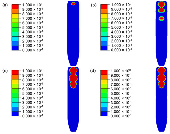In the simulation results, the head part of PBX1314 is always compressed while the tail part undergoes three impacts with the projectile. This results in a non-uniform distribution of damage in PBX1314 in Figure 15. Severe damage ranges from the tail to the middle region, while the head is rarely damaged. This agrees with the experimental results in Section 2. Figure 15 reveals that PBX1314 damages mainly in the first two compression–rebound cycles in Figure 14d. This is due to the severe impacts in the first two cycles. Microcrack surface temperature distribution on the tail surface of PBX1314 is shown in Figure 16. It reveals that the first and second impacts lead to heat generation and localization on the tail surface of PBX1314. Weak chemical reactions are triggered near some microcrack surfaces. The third impact results in initiation near these sites.