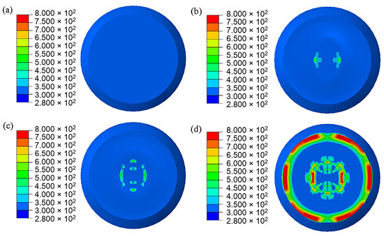 Evolution of the microcrack surface temperature of the PBX1314 main explosive. (a) 500 μs. (b) 1300 μs. (c) 2300 μs. (d) 3300 μs.