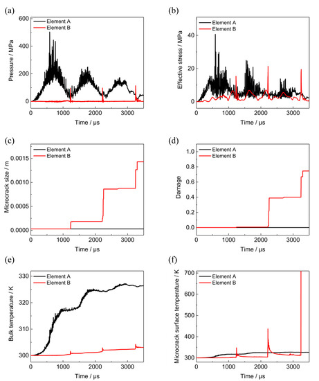 History curves of several variables of Element A and B. (a) Pressure. (b) Effective stress. (c) Microcrack size. (d) Damage. (e) Bulk temperature. (f) Microcrack surface temperature.