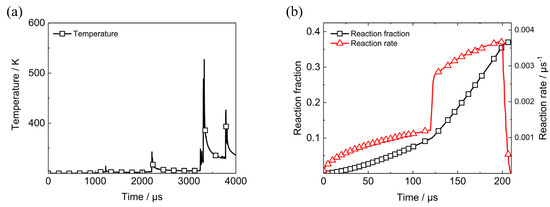 Temperature and reaction process in Element B. (a) Temperature history on the microcrack surface, (b) reaction fraction and reaction rate.
