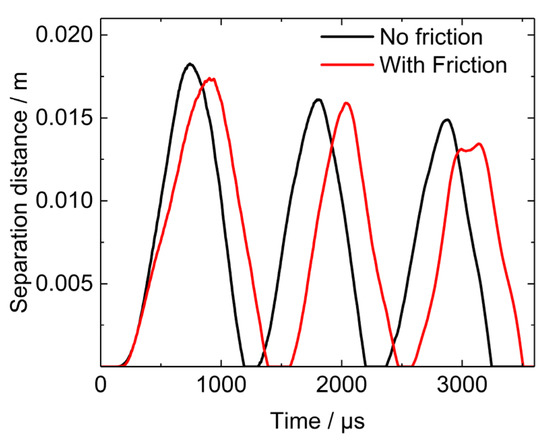 Evolution of separation distance between the tail of PBX1314 and projectile (The curve ‘No friction’ has been displayed in Figure 14b).
