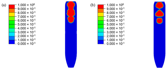 Damage distribution in PBX1314. (a) No friction between the projectile and PBX1314 (It corresponds to the Figure 15d.), (b) Friction exists between the projectile and PBX1314.
