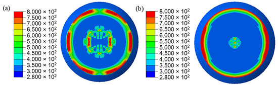 Non-shock initiation occurs on the tail surface of PBX1314. The initiated zone is illustrated in Figure 22. As the impact between the tail of PBX1314 and projectile is weakened due to the shell-PBX1314 friction, heat generation and localization near the microcracks is weakened. Therefore, the initiation zone in Figure 22b is smaller than that in Figure 22a. The temperature distribution on the lateral surface of PBX1314 is shown in Figure 23. The shell-PBX1314 friction results in a temperature rise on the lateral surface of PBX1314. However, the temperature is far below the local initiation temperature of PBX1314 (700 K).