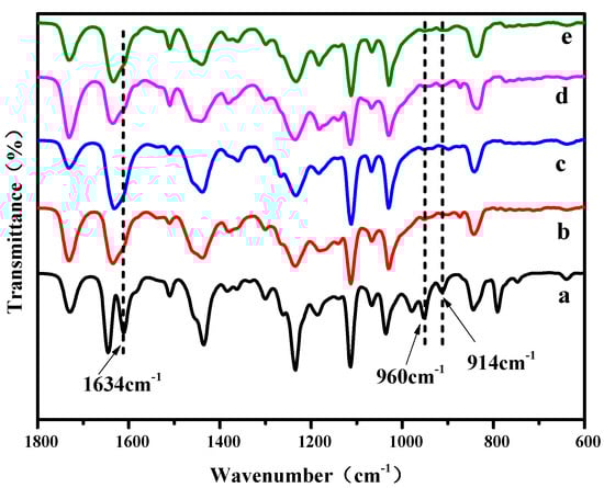 FT-IR spectra of the liquid resin and UV-cured hybrid resin with different content of UV-6110 (a, uncured hybrid resin; b,10% epoxy resin; c, 20% epoxy resin; d, 30% epoxy resin; e, 40% epoxy resin).
