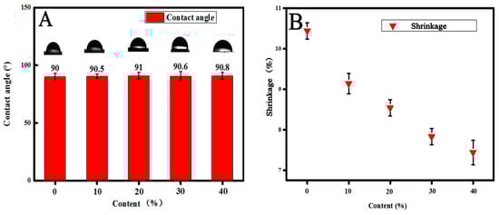Influence of the modification ratio on the water contact angles and polymerization shrinkage of the UV-cured polymer. ((A), contact angles of samples with different contents of epoxy; (B), Shrinkage of samples with different contents of epoxy).