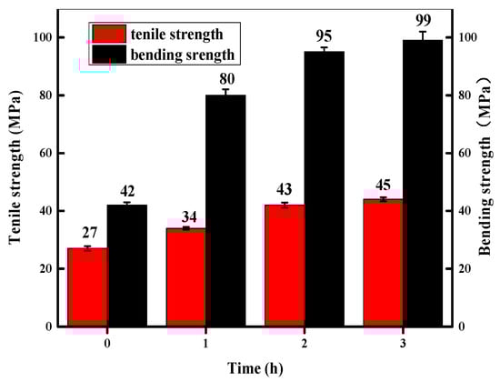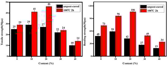 The mechanical properties of the printed objects before and after post-curing were studied and analyzed, and the results are shown in Figure 3 and Table 2. The tensile strength and bending strength of the optimal samples before post-curing were 29 ± 1.4 MPa and 58± 2.1 MPa, respectively. The tensile strength and bending strength of the samples at 20% of epoxy monomers after post-cuing were 28.46 ± 0.5 MPa and 106 MPa, respectively. Therefore, the tensile strength of the samples after post-curing increased by up to 64% compared with the samples without post-curing. The bending strength increased up to 150%, which indicated that the mechanical properties of the 3D-printed samples were apparently improved after post-curing treatment.