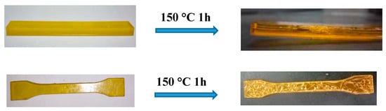 The heat treatment of 3D-printed objects was performed for 1 h at 150 °C, 100 °C, and 80 °C in a vacuum oven. The results shown in Figure 4 indicated that the printed samples were warped after heating, exhibiting higher shrinkage along the y-axis [31,32]. This observation revealed that excessive temperature during the post-curing process would induce parts of distortion. The reason was probably that while the external part of the sample heated up during the heat treatment, the internal part remained cool, leading to an uneven thermal change, which resulted in the external resins bearing bigger tensile stress. Ultimately, the differential thermal strains were generated, and cracking and warping were produced. As shown in Figure 5, many cracks were formed around the sample treated at 150 °C for 1 h.