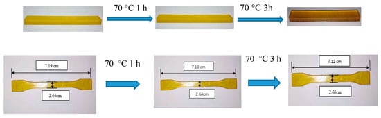 After studying the tensile strength and elongation properties of the solidified resin samples by using varying ratios of PUA and ACMO, the optimal ratio of PUA to ACMO was confirmed as 3:7. The PUA/ACMO/UV-6110 hybrid resin was prepared by mixing different concentrations of PUA, ACMO, UV-6110, the free-radical photoinitiator Irgacure 819, and cationic photoinitiator Irgacure 261. The obtained photosensitive resins were stirred in a 3-neck flask at 50 °C for 30 min. A desk 3D printer with liquid crystal display (LCD) irradiation was used to print some designed objects for the evaluation of the mechanical properties of the resin. Three samples were designed and printed simultaneously with an inclination of 0° with respect to the printing platform. After printing, the formed samples were rinsed with ethanol in two successive baths for 15 min and then placed to dry. After that, the 3D-printed objects were post-cured in a dark vacuum oven at different temperatures. The heating treatment time and temperature for the post-curing process were set as 150 °C and 1 h, 100 °C and 1 h, 100 °C and 2 h, 80 °C and 1 h, 70 °C and 1 h, 70 °C and 2 h, and 70 °C and 3 h, respectively.