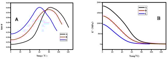 Dynamic mechanical analysis (DMA) curves of hybrid polymer storage modulus loss factor tan δ (A) and E′ (B). (A: 70 °C 3 h 20% epoxy monomer content resin; B: 70 °C 3 h 0% epoxy monomer content resin; C: 20% epoxy monomer un post-cured content resin).