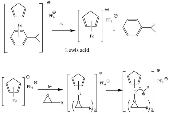 In general, free-radical polymerization is made up of four continuous processes involving initiation, propagation, chain transfer, and termination. In the initiation process, the photo-initiator can transform from the ground state to the excited state after absorbing UV radiation, thus producing a chemical change to form some reactive intermediates of radicals, which can initiate the next polymerization between radicals and molecules of monomers or oligomers (e.g., with acrylates), forming reactive alkylmonomers. Those free-radical monomers with high reactivity can further react with other monomers or oligomers within the process of propagation. Chain transfer is a reaction process in which the reactive center interacts with a monomer or oligomer to produce another new free radical, which implies that the initial growth of the polymer radical has been terminated. The termination reaction is mainly completed by the interaction of two radicals, leading to the disappearance of the reactive center and the formation of stable polymers. One way of termination is the binding of two radicals in the active chain, and the other way happens through the disproportionation for bimolecular termination. Sometimes, the two ways happen simultaneously. The polymerization process ends when all the chemicals have reacted each other completely. The obvious fact is shown that the increase in the viscosity of the resins will hinder the movement of the molecular chains in spite of the presence of unreacted compounds [26]. In general, the cationic polymerization process also contains four steps. Differently from in the free-radical polymerization process, the cations act as the reactive center in the cationic polymerization. During UV light initiation, the cationic initiator can transform into an excited state, forming a new reactive center. For example, when using aryl-ferrocenium salts such as (cumene) cyclopentadienyliron(ii) hexa-fluorophos (Irgacure 261), the salt can be decomposed into cumene and ferrocene lewis acid under UV light irradiation. In terms of the hydrogen donor produced from the polyethers commonly used in the hybrid photosensitive resin, the aryl-ferrocenium cations produce protons combined with the anion and offer Brönsted acids, which can initiate the ring-opening reaction of epoxides. After reaction with Bronsted acids, the epoxide ring is opened and carbonium cations are produced, which can initiate the opening of other epoxide groups and lead to chain propagation [26]. The depicted mechanism of the cationic polymerization process is illustrated in Scheme 1.