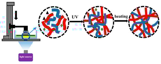 According to the imaging principle of a photosensitive 3D printer with LCD light irradiation, the image signals are provided by a computer program and displayed on a screen driving circuit [28]. Some transparent areas are selected and appear on the screen before irradiation. Under the irradiation with the LCD lights, the transparent region of the images displayed on the liquid crystal screen reduces the barriers to the LCD lights. However, in those regions without image display, the UV lights are blocked. The UV lights transmit through the LCD screen to form an area with images of UV lights. There is a liquid tank located on the surface of the liquid crystal screen. A transparent film is set at the bottom of the liquid tank. The LCD lights radiate directly to these liquid photosensitive resins through a transparent film so that those resins can be polymerized by the curing reaction and then solidified [29]. The opaque part of the LCD screen blocks the UV lights, and those resins without UV light irradiation still remain in the liquid state in the printing process. The display accuracy of the LCD screen is generally high. The resolution of the 3D printer that we used is 1280 × 768 pixels, and the dot matrix accuracy of the inch splay is 0.16 × 0.16 mm, which means that the size accuracy of the product formed through the LCD can reach 0.16 mm. The liquid crystal screen images from direct molding have a low deformation rate for graphics and high product accuracy. Typical cationic photopolymers, such as epoxides or oxetanes, are insensitive to oxygen but have the disadvantage of a low curing rate, resulting in some unreacted epoxies still existing in the printed objects. It was difficult to form a perfect IPN structure except by a post-curing process, such as heat treatment as shown in Scheme 2.