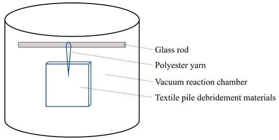 A series of sliver knitted pile fabrics with a double faced structure were manufactured on a circular knitting machine, followed by back-coating, thermosetting, and shearing, as reported in our previous work [13,17]. In order to further improve the liquid absorption properties of the textile pile debridement material, low temperature plasma surface modification was applied with a plasma treatment instrument (HD-300, Zhongkechangtai Plasma Technology Co., Ltd., Changzhou, Jiangsu, China). The textile pile debridement material was first cut into the size of 10 cm × 10 cm, followed by 30 min of ultrasonic cleaning in acetone and rinsing in distilled water three times. After becoming completely dry in a vacuum drying oven (DZF-6030B, Shanghai Yiheng Technology Co., Ltd.), samples were put into the vacuum reaction chamber (height 30 cm and diameter 30 cm) of the plasma treatment instrument under the power of 150 W for 1, 2, 3, 4, and 5 min in atmospheres of oxygen or helium. The plasma treatment setup is illustrated in Figure 1.