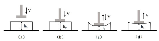 Diagram of the compression test process: (a) initial state, (b) presser contact with sample, (c) presser drop at lowest position, (d) final state.