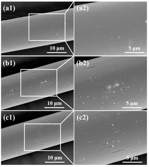 Figure 4 shows SEM images of the polyester fiber surface before and after plasma treatment. It can be clearly seen that the surface of the pile fiber without plasma treatment is relatively smooth, but after oxygen or helium plasma treatment, the surface of the pile fiber becomes much coarser. Grooves parallel to the fiber axis and granules were found on the surface, indicating that the oxygen and helium plasma treatment damaged the surface morphology of the pile fibers. This may be caused by the physical etching of plasma modification [22]. A large number of active particles were generated during plasma discharge, which bombarded the fiber surface, leading to the gasification of some solids on the fiber and the formation of micro grooves, as shown in Figure 4. It was also reported that plasma treatment destroys the chemical chain segment of polymers, causing a degradation reaction of macromolecules and the generation of new small molecular substances. These small molecules remained on the surface or were wrapped in the active particles, forming white particles, as shown in Figure 4. In addition, the impact of active particles during plasma treatment destroyed the crystalline area in the polyester macromolecular structure, changing it into the disordered amorphous region, resulting in a relatively obvious morphological change. The comparative analysis of oxygen and helium plasma treatments showed that the number of grooves and granules on the fiber surface in Figure 4b is relatively higher than that in Figure 4c, indicating that oxygen plasma has a relatively higher effect than helium plasma does. This is due to the fact that oxygen is chemically active, while helium is a kind of inert gas. The difference in chemical properties leads to distinctions in the surface modification mechanism and energy during the plasma treatment.