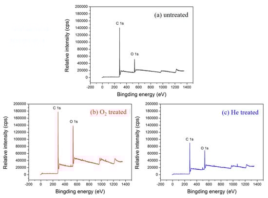 XPS overall scans of the (a) untreated, (b) oxygen, and (c) helium plasma-treated textile pile materials.