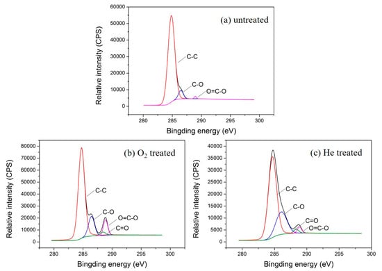 C 1s spectra of the (a) untreated, (b) oxygen, and (c) helium plasma-treated textile pile materials.